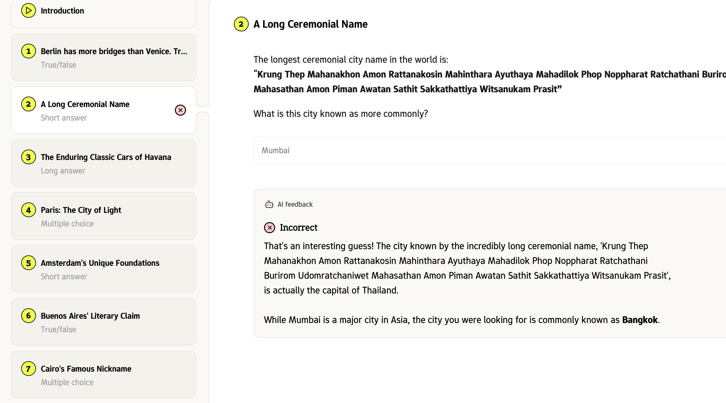Je kunt ‘directe feedback’ in- of uitschakelen voor elke (oefen)toets, zodat Examplary onmiddellijke feedback geeft op het antwoord van een student op basis van het lesmateriaal.