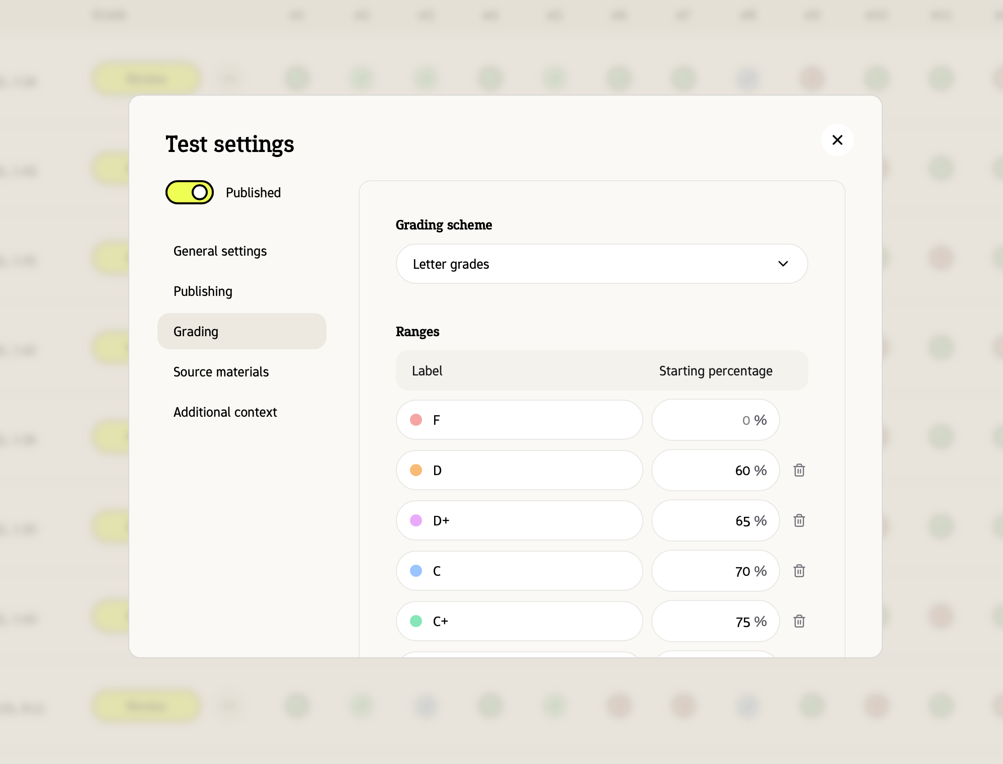 Je kunt nu selecteren hoe je toets beoordeeld moet worden. Gebruik een van de vooraf gedefinieerde beoordelingsschema’s, of maak een aangepast schema.